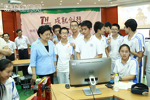 清华附中于2013年建立了学生创客空间,在国内率先把中学生创客教育提上日程。在学生创客空间,一系列科技创意作品引起了刘延东的注意,她和同学们一起查看“全息投影模型”,操作“形独游戏软件”,询问“四轴飞机”的工作原理。在高一(二)班邓悦麟、刘孟桢同学制作的“防爆排雷机器人”跟前,刘延东饶有兴趣地观看了机器人的“排雷”过程。她说,培养学生的创新思维非常重要,教育部门要与学校密切配合,设计有针对性的教学项目并做好普及工作。