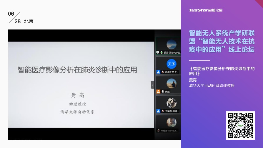 黄高在报告中介绍了在新冠肺炎疫情防控期间研发出的新冠肺炎CT影像快速辅助诊断设备。在湖北疫情高峰期间,由于核酸检测存在较多误检和检测能力不足的问题,因此通过胸部CT影像对新冠患者进行筛查是实现“早发现、早隔离”的一种有效补充手段。然而,医生阅读一例完整的CT影像需要20-30分钟,难以及时诊断大量的疑似患者。该辅助诊断设备基于黄高发明的DenseNet等人工智能深度学习算法,融合多任务学习以及模型轻量化技术,可在20秒内完成对一份完整CT影像的自动分析,准确率达95%以上,从而辅助医生大幅提升诊断效率和诊断水平。截至2020年3月31日,该系统在湖北火神山等国内120家医院投入使用,累计分析病例30000余份,有效地减轻了一线医务人员的负担。